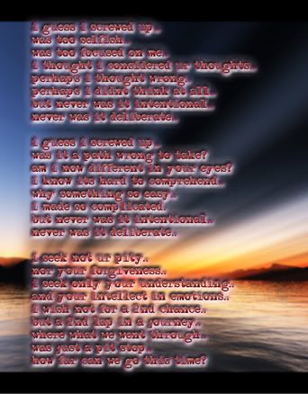 I forgot how it felt..really..i didnt know how to express it. It had been hard so far, to accept the overwhelming emotions that came. I felt fear..fear that cripples me from my heart. Although the hardness of my heart fenced me away from you, my eyes and emotions were not blind to your sincerity..not dumb towards your genuine efforts. I'm sure whatever i say now won't matter..not anymore.
